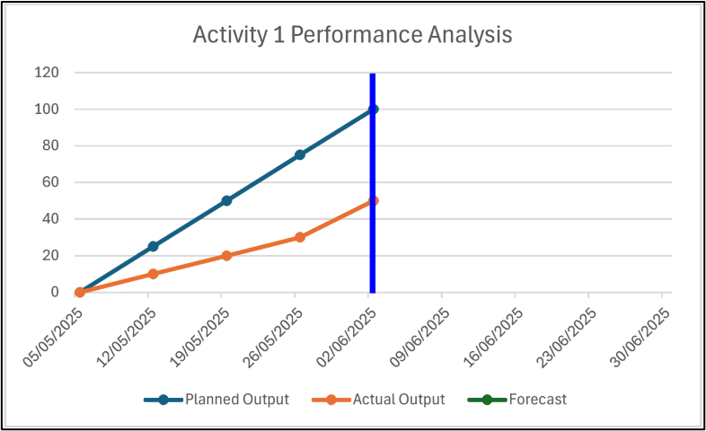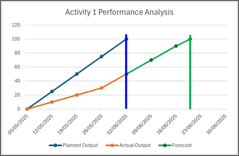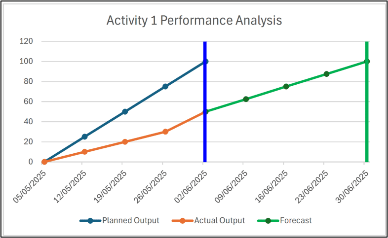 Activity 1 in this example is a driving critical activity, therefore any delay to it has a direct equal effect on the completion date for the whole project. Having the performance data available and presented in a simple format, such as these graphs, the project team is better equipped to make informed decisions and potentially take corrective actions.