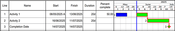 After 4 weeks, the programme is updated, and a measure of the work shows that 50% of Activity 1, which started on 06 May, has been completed.